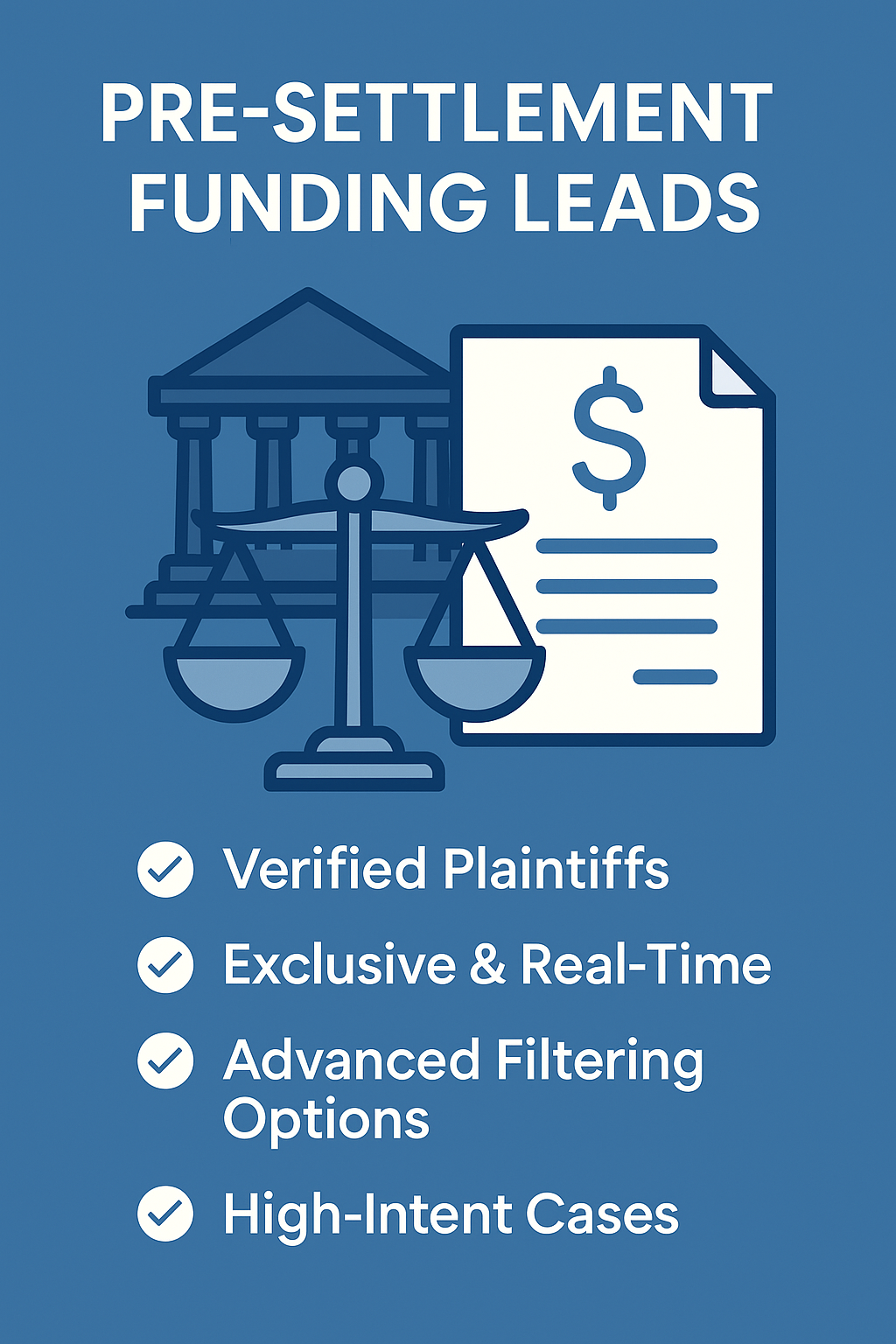 Order your Pre-Settlement Funding Leads today. Use advanced filters to target verified plaintiffs by case type, stage, and urgency — and start receiving exclusive, real-time leads delivered straight to your inbox or CRM.